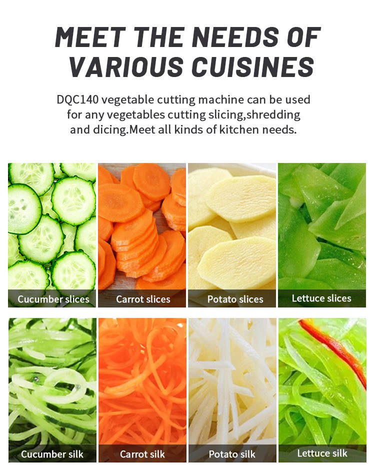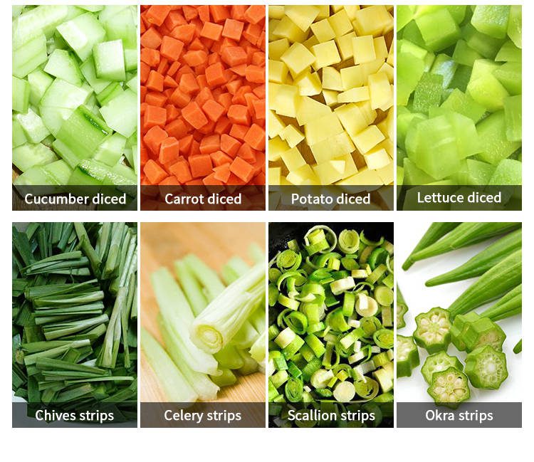 - The machine can cut vegetable into thick slices, thin slices, four corner shreds, round shreds, strips and cubes.