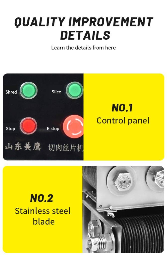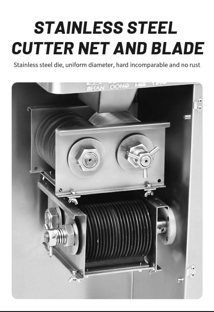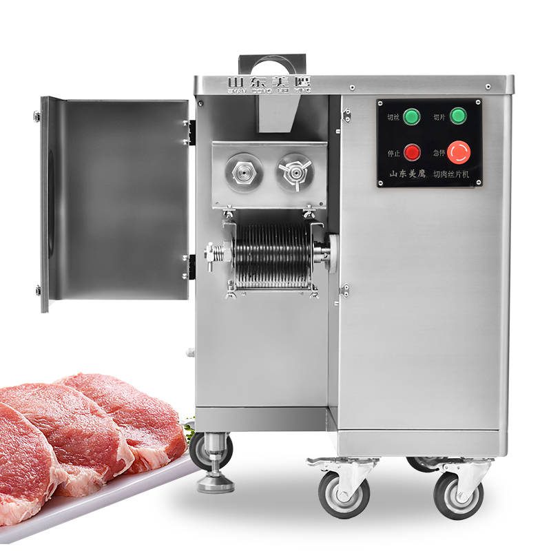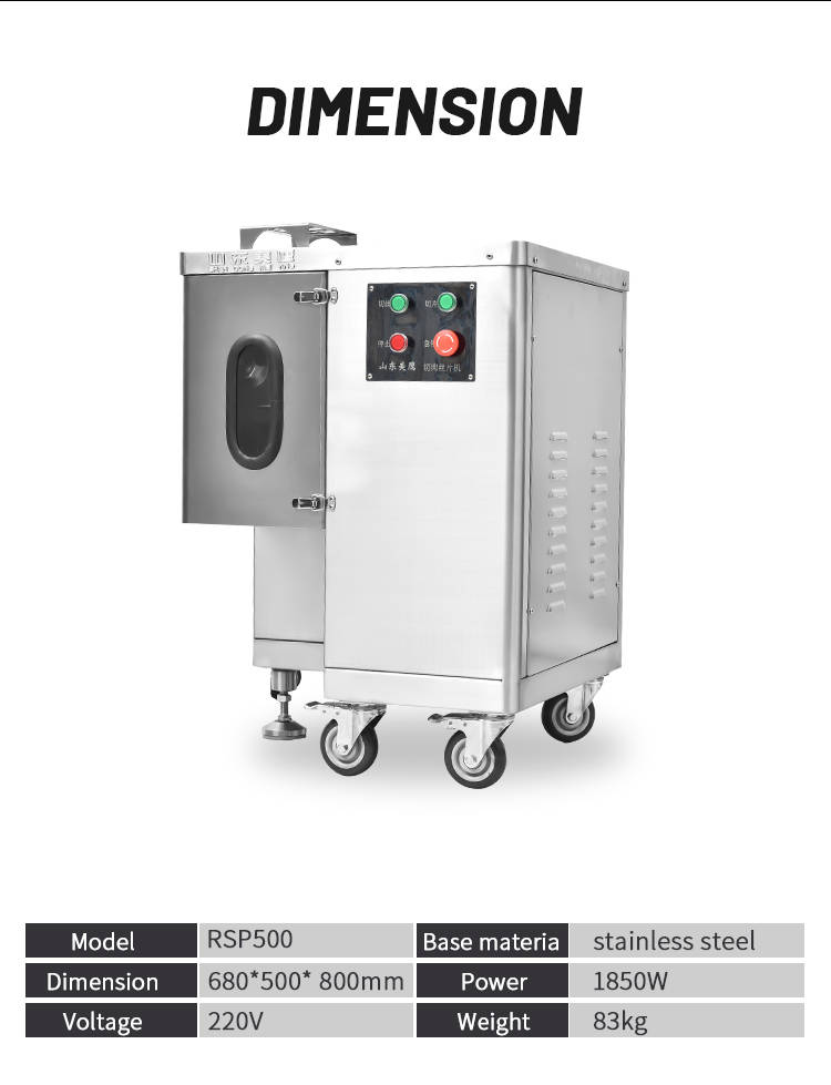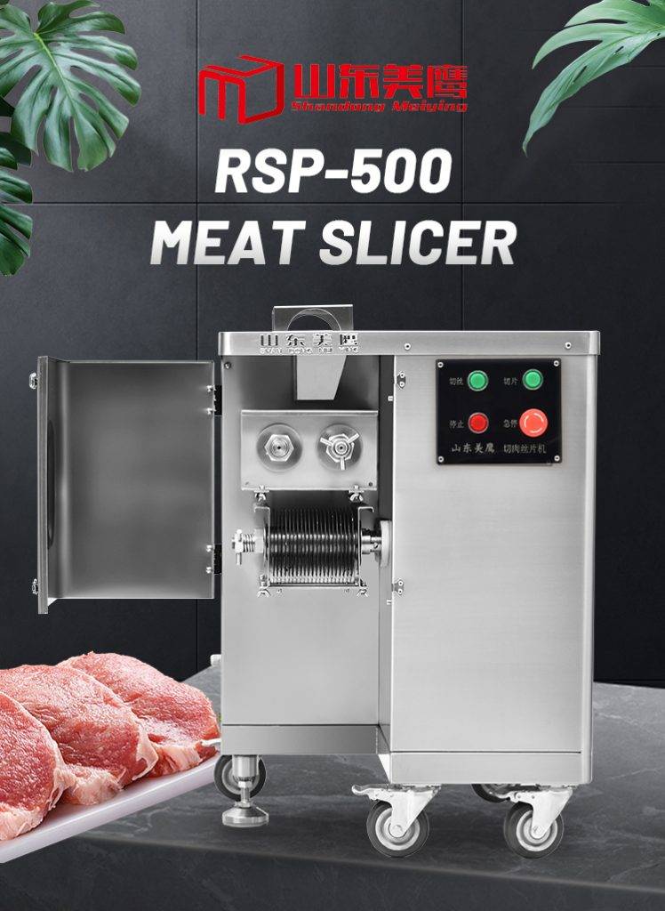 RSP-500 shredded meat slices are a primary molding machine it is our company to comply with the market demand and carefully designed, manufactured meat processing machinery.The machine is available accordingly Household needs,processing all kinds of meat slices, shredded meat and other ingredients.This machine cut meat slice thickness is uniform, clear cut meat strips, multi-specification cut meat silk selection, removable type knife group,the product exterior is round and beautiful, stable and efficient performance, simple and practical operation,and more in line with the national food safety and hygiene requirements, a wide range of applications,Is the hotel, restaurants, restaurants, unit canteen, meat processing enterprises and market merchants.