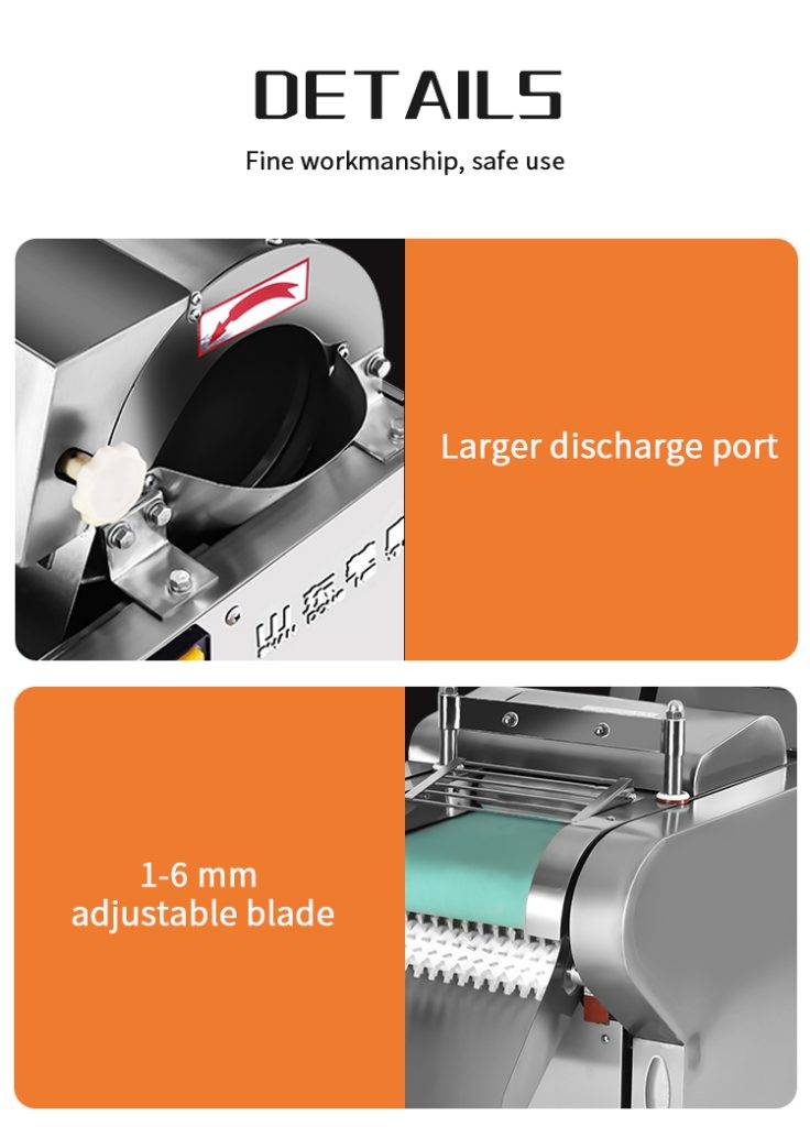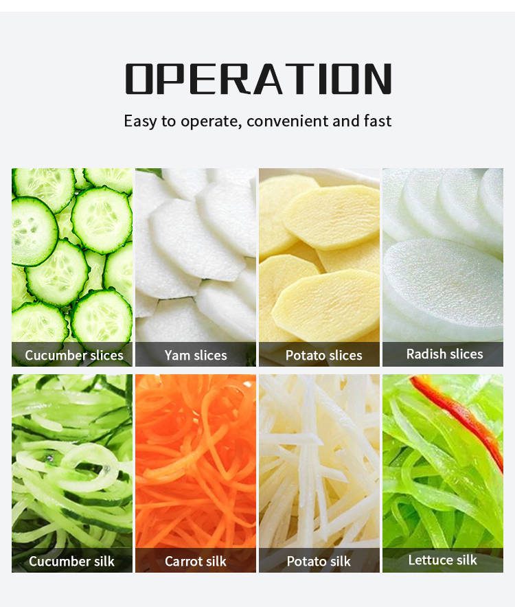 - 1.The compound multifunctional vegetable cutting machine, which is suitable for the processing of all kinds of root, stem, leaf vegetables.